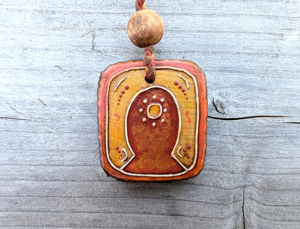 Amulette en bois, fabriquée et peinte à la main de façon artisanale.